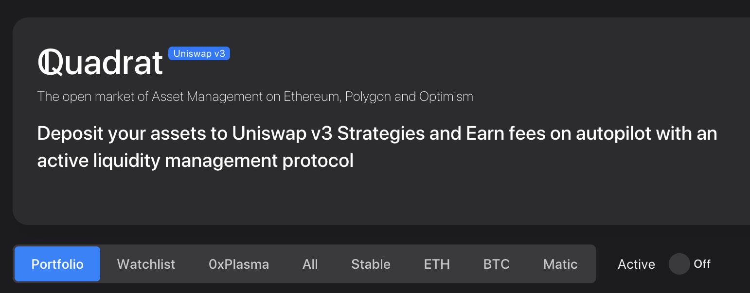 **The Quadrat Protocol is a non-custodial protocol.** Your assets in the protocol automatically will be deployed to Uniswap v3 Pool at the Strategy's Price Range, and only your wallet can withdraw assets back from the Strategy.